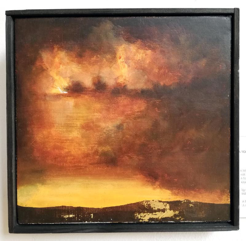 A hatalmas, sárgásbarna, sötét felhőkkel borított égbolt baljóslatú hangulatot kölcsönöz a képnek. Alul a táj alacsony horizonton csak jelzésszerűen jelenik meg. Az olajfestmény ragyogóan kifejezi Pilinszky mélyen szántó gondolatait: „A többi kegyelem / A félelem s az álom / volt apám és anyám / A folyosó meg a / kitáruló vidék / Így éltem. Hogy halok meg? / Milyen lesz pusztulásom? / A föld elárúl / Magához ölel / A többi kegyelem.”