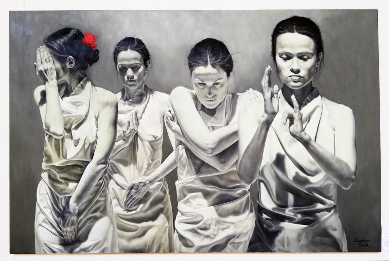 A kép fekete-fehér, fotószerű kidolgozásával a hiperrealizmust idézi. Csak egy piros virág fedezhető fel az egyik lány hajában. A lányok nem néznek fel, és a nézőre sem, egyáltalán nem vidámak, mozdulataikból szomorúság sugárzik. Pilinszky Hasonlat című verse ihlette.
