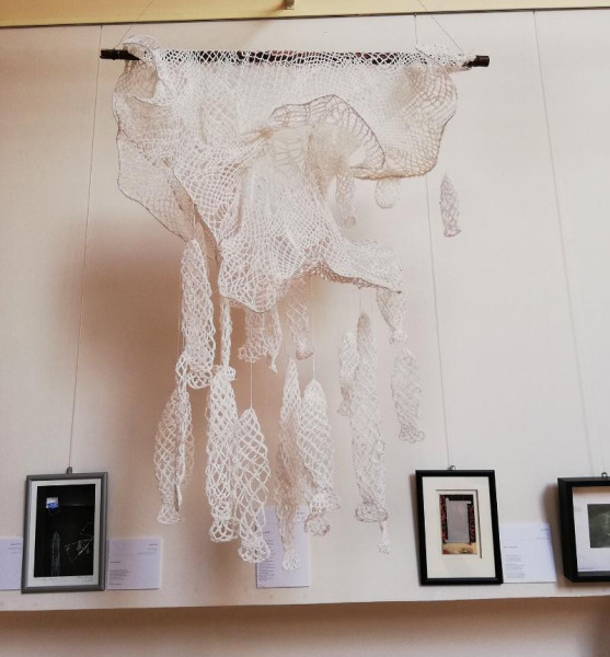 Kecseti Gabriella Halak a hálóban című textilalkotása Pilinszky azonos című versének vizuális megfogalmazása.