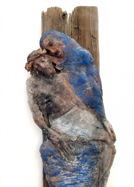 A színezett fa és kerámia felhasználásával készített alkotás mintha csak a faluszéli régi fakeresztekre, corpusokra, vagy a halott Krisztust térdén fektető, fájdalmasan karjaiban tartó Mária-ábrázolásokra emlékeztetne. Öreg, korhadt deszka háttér előtt kopottas kék színű ruhában siratja Mária egyetlen fiát. A halott Krisztus kezei mintha már a leszáradt csont maradványai lennének. A végtelenül szomorú elmúlás legékesebb bizonyítéka a kiállításon ez a szobrászati alkotás. Piéta: „Cserben hagyott tulajdon tested, / a rádzúduló tetemet / már nem bírták és szakadozva / elengedték az idegek.” Ez az egy versszak is szinte mindent elmond a számunkra, a kiállításon a teljes verseket az alkotások mellett olvashatjuk.