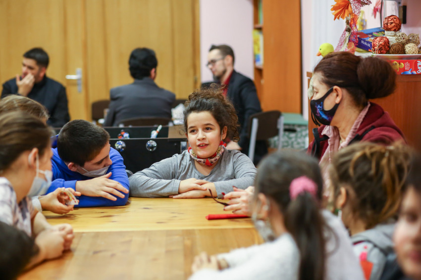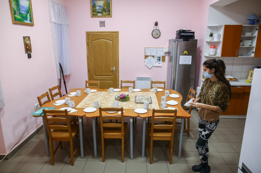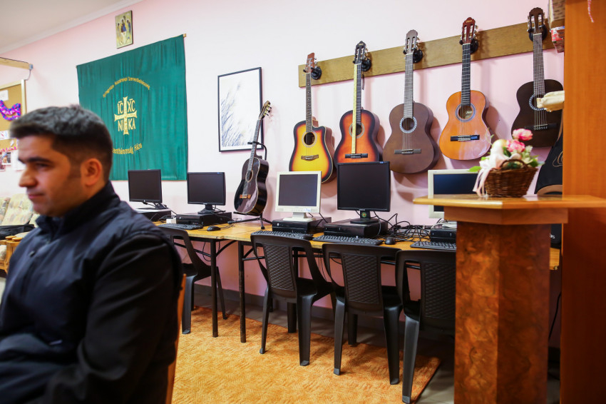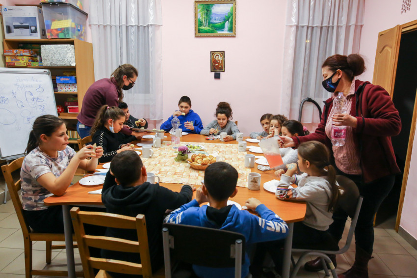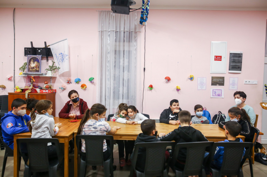 Az épületben a legtágasabb helyiség a közösségi tér; középen asztalok, a falak mentén polcok, rajtuk könyvek, társasjátékok. A terem egyik végében számítógépek, a sarokban nagy szőnyeg. A mennyezetre szerelve vetítővászon és projektor. Ez utóbbiakat abból az összegből vásárolták, amit a nemzetközi romahimnusz-feldolgozásukkal nyertek, ugyanis első helyezést értek el. A falon sok-sok dekoráció, a faliújságon farsangi díszek. A teremből az egyik ajtó a kápolnára nyílik. Ez az imádság és a vasárnapi szent liturgiák helye. A másik oldalon a teakonyha, ahol a technikai alkalmazott, aki egyúttal szakács is, minden este valamilyen finomságot készít a gyerekeknek. „Igyekszünk meleg ételt adni nekik. Tejbegrízt, tejberizst, hot-dogot, bundás kenyeret, olyasmit, amit szívesen elfogyasztanak, és laktatóbb is, mint egy szendvics. A hónap végén mindig nagyobb az étvágyuk, otthon akkor már kevesebb jut” – mondja Ede atya.