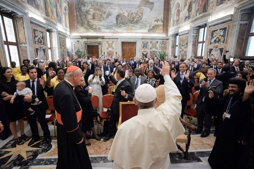 A pápa szívélyesen üdvözölte Christoph Schönborn bécsi bíboros-érseket, a kezdeményezés elindítóját és Christiaan Alting von Gesaut, a szervezet elnökét, megemlítve, hogy idén nemcsak nagy számban érkeztek résztvevők a konferenciára, hanem szélesebb skálán képviselik az Egyház egyetemességének az emberi arculatát. A Szentatya külön szeretettel köszöntötte a katolikus országgyűlési képviselők körének új, afrikai tagjait.