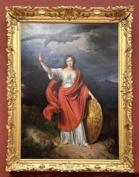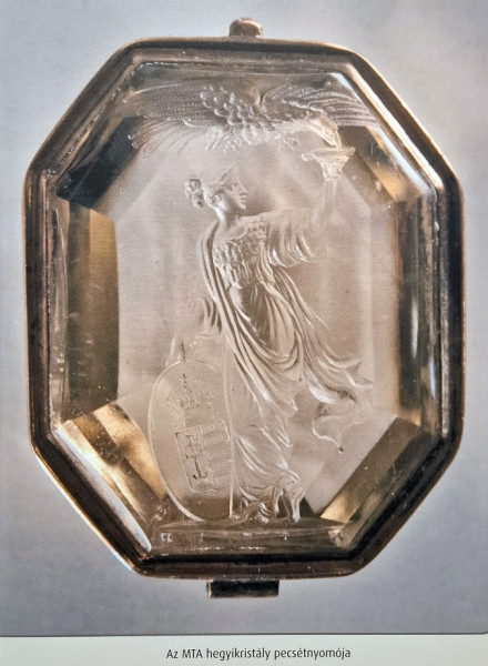 De menjünk tovább, hiszen rengeteg még a látnivaló! Egy igazán nagy terem a következő állomásunk, amelynek jobb oldalán a Magyar Tudós Társaság címerképe is látható. Széchenyi István 1834. június 4-én jelentette be, hogy az Akadémiának ajándékozza a „társaság címerét tevő allegóriai ábrázatot”. A festmény előzménye az a címerrendeltetésű pecsét volt, amelyet Széchenyi és barátja, Waldstein János útmutatásai alapján Johann Nepomuk Ender tervezett, és Franz Xaver Stöber metszett a Tudós Társaság számára. A közösen kialakított koncepció eredményeként 1832-ben született meg az intézmény pecsétje, amely először a tagsági okleveleken bukkant fel, majd 1834-től az intézmény címerévé vált. A terem hosszú falának tengelyében ez az emblematikus, bizonyos értelemben enigmatikus festmény áll. A címertartó funkciót betöltő nőalakot többször próbálták már beazonosítani, de mindezt megnehezíti, hogy a nőalakról hiányoznak az olyan attribútumok, amelyek egyértelműen meghatározhatnák személyét. A pajzson olvasható jelmondatot – Borúra derű – a kép hátterében elvonuló viharfelhők látványa ismétli; a pajzs belső mezejében pedig Pallasz Athéné hajtja fel a Hungária szemét addig sötétségben tartó leplet. A pajzs legnagyobb részét egyébként a Szent Leó pápa és Attila találkozását megörökítő jelenet tölti ki. A 452-ben lezajlott találkozó folyományaként a hódítók megkímélték Itáliát a pusztítástól, másrészt véget is vetett a hunok nyugat-európai inváziójának: a magyarok őseinek tekintett hunok békét kötöttek az Egyházzal és a pápa közvetítésével a Római Birodalommal is.