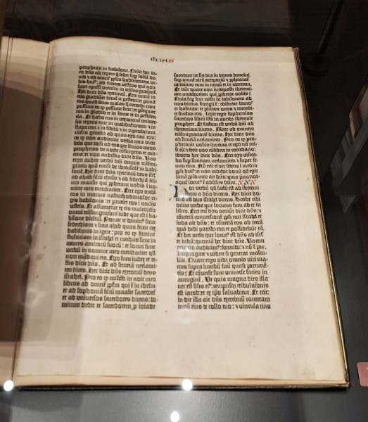 A kiállításon megismerhetjük azt is, mi jellemezte a könyvnyomtatás első évtizedeit. A tömeges olvasásigényt Johannes Gutenberg találmánya, a mozgatható betűkkel történő könyvnyomtatás tudta kielégíteni. Gutenberg 1456 táján nyomtatta ki két kötetben fő művét, a negyvenkét soros Bibliáját, a latin nyelvű Vulgátát, amelyből mai tudásunk szerint összesen kétszáz példány készült, és belőlük alig negyven példány maradt fenn. Az első kötet 324, a második 327 oldalas.