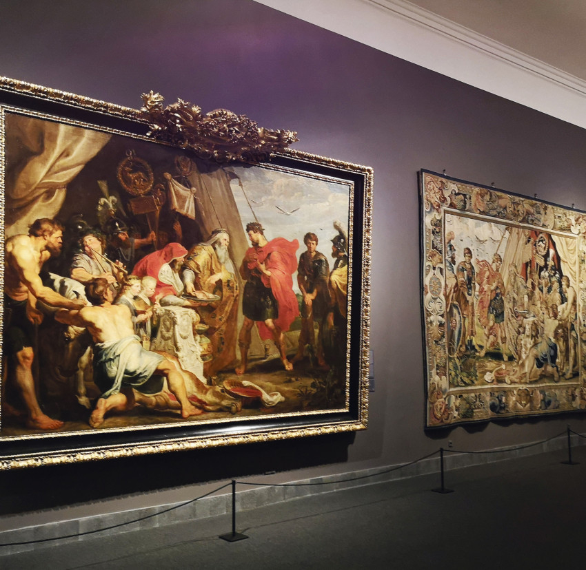 De térjünk most vissza a kiállításra, hiszen rengeteg a látnivaló, nem is valószínű, hogy minden befogadható egy szuszra. Szerencsére a tárlat február 16-áig tart nyitva, akár többször is megnézhető. Kuriózuma mindenképpen Rubens A jóslat kinyilatkoztatása című festménye, amely Publius Decius Mus római konzul életéből mutat be egy epizódot. A festmény alapján egy hasonló méretű gobelint is készítettek. A két műalkotás most egyszerre látható a kiállításon. A festmény tulajdonképpen tervvázlata a szövésre váró gobelinnek. Rubens semmit sem bízott a véletlenre: nemcsak egy kisméretű olajvázlatot és egy, a kompozíciót ennél már pontosabban ábrázoló, valamivel nagyobb méretű modellót készített kartonra, hanem egy vászonra festett olajképet is, mégpedig az eredeti méretben. Ezek a kárpithoz képest oldalfordított művek éppen olyanok, mint a művész más, teljesen kidolgozott festményei. Rubens a szövéshez használt fonalak festőit ezzel nagy feladat elé állította: a rendelkezésükre bocsátott gyapjúból és selyemből a lehető legpontosabban kellett visszaadniuk az olajfesték különböző árnyalatait.