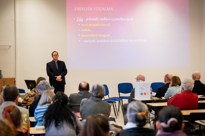 Lengyel Zsolt főiskolai adjunktus előadásának témája az ereklyetisztelet volt. Történeti áttekintéséből megtudhatták a résztvevők, hogy az ereklyék tisztelete akkor kezdett terjedni, amikor Valerianus császár 257-ben betiltotta a vértanúk sírjánál bemutatott szentmiséket. Később az Egyház a nyilvános és helyes kultusz érdekében pontosan szabályozta az ereklyék hitelesítésének körülményeit, folyamatát, valamint a boldoggá és szentté avatási eljárásokhoz kapcsolódó feltételeket, elkerülendő az ereklyékkel történő visszaéléseket.