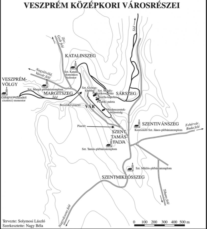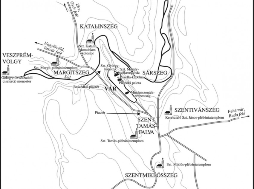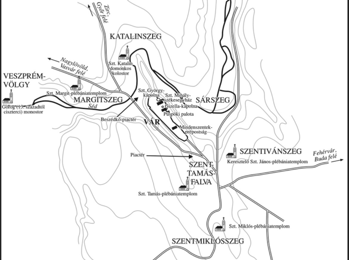 Veszprém középkori szakrális helyeinek mintegy fele a város egyházi-világi igazgatási központjára, a várhegyre koncentrálódott. Ismert, hogy a Szent Mihály-székesegyház foglalta magában a középkor végére a település legősibb keresztény épületét, a Szent György-kápolnát; a Szűz Mária-altemplomon (kriptán) kívül a Szentlélek-, a Szent László- és a Szent Márton-kápolnák tartoztak a püspöki széktemplomhoz. A várban volt található még a veszprémi iskola ugyancsak Szűz Mária-kápolnája, a bizonytalan eredetű, úgynevezett Gizella-kápolna, illetve az oklevélben is említett társaskáptalannak a vár külső részén, a róla elnevezett Mindenszentek várában, a mai törvényszék környékén álló temploma.