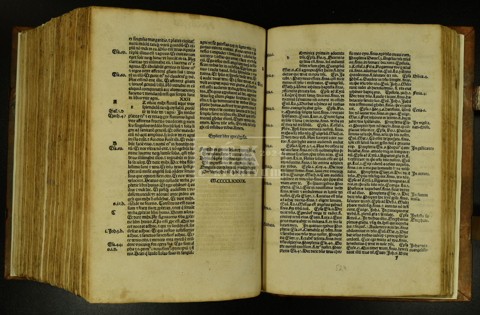 A három dupla bordára fűzött, fatáblás, kapcsos könyv eredeti kötése nem ismert. A kötet a Szentírás egyszerű kiállítású, iniciálékat nem tartalmazó, részben rubrikált kiadása. Egykori rendszeres használatáról a lapszéleken nagy számban olvasható középkori, latin nyelvű kéziratos bejegyzések tanúskodnak.