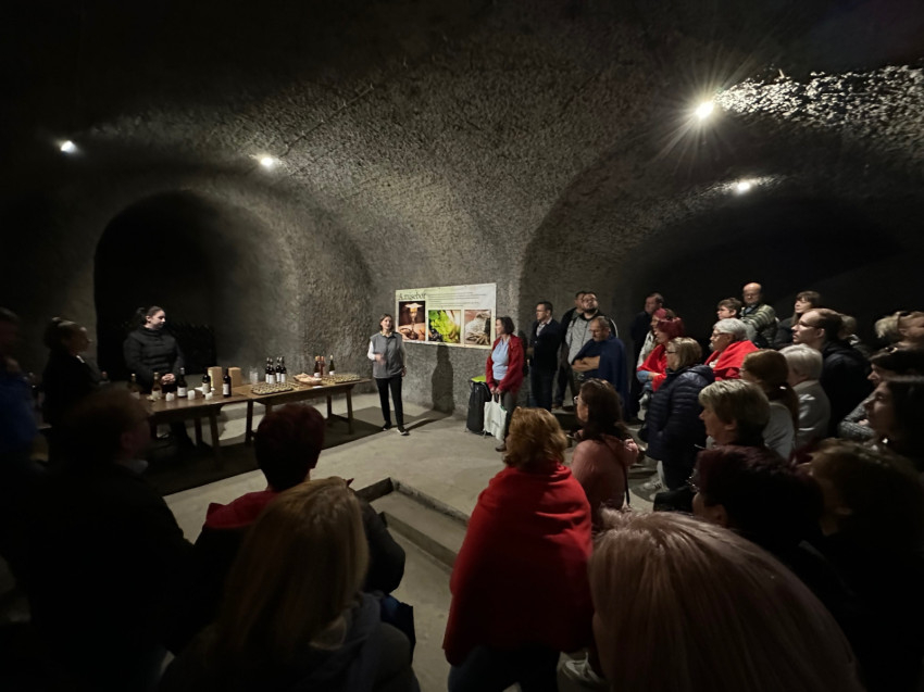 Különleges élményt nyújtott a város alatti pincerendszer felfedezése, ahol vendéglátóink borkóstolóval is kedveskedtek.