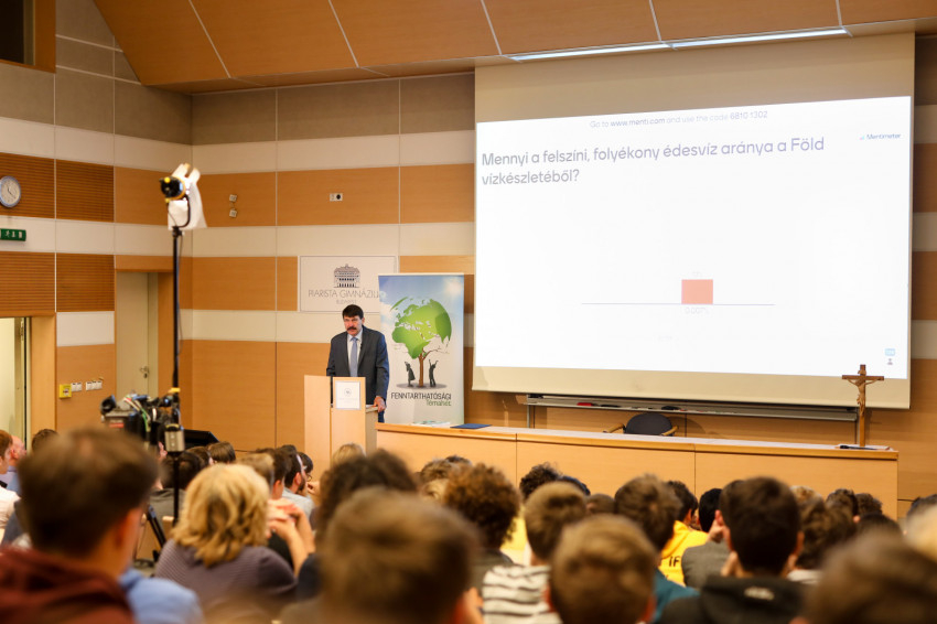 Idén a labdarúgó-világbajnokságot Katarban rendezik meg, a helyi klíma miatt novemberben. Mivel a hőmérséklet várhatóan még ekkor is magas lesz, a stadionokat hűteni fogják, a száraz éghajlat miatt a gyepet pedig folyamatosan öntözni kell – az ehhez szükséges víz előállítása viszont óriási költségekkel jár. Úgy tűnik, hogy a bajnokság szervezőinek a klímavédelmi szempontok nem voltak fontosak. „De vajon mennyi a felszíni, folyékony édesvíz aránya a Föld vízkészletéből?” – tette fel a kérdést Áder János a diákoknak, amire egy applikáció segítségével válaszolhattak.
