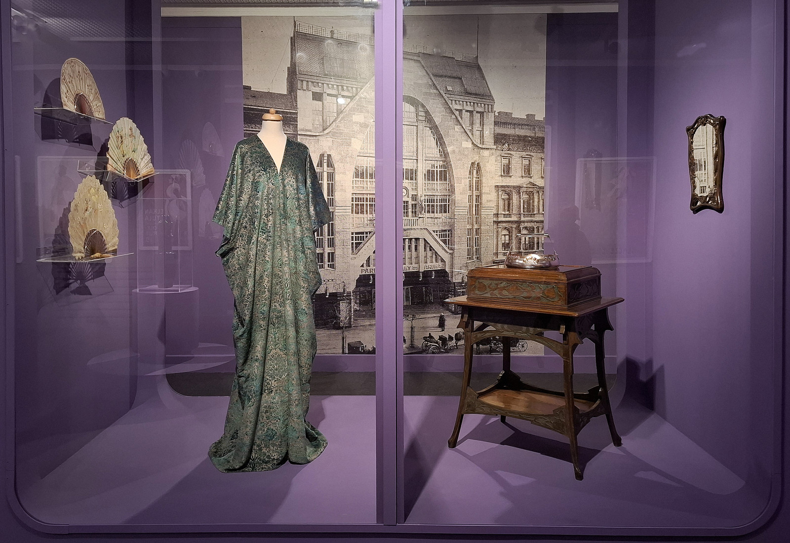 A kiállítás szimbóluma az az aranyozott bronz asztali villanylámpa, amely A fátyoltáncosnő címmel látható az első teremben. Az amerikai származású Loïe Fuller (1862–1928) táncosnő a századfordulós Párizs sztárja volt. 1898-ban lelkes fogadtatás mellett Budapesten is fellépett. Híres szerpentintáncában színes fényekkel megvilágított óriási fátylakkal, örvénylően mozgott. A tánc – a szecesszió szimbólumaként – az emberi alakot dekoratív ornamenssé változtatta. Fullert többen is megörökítették, például Koloman Moser és Toulouse-Lautrec. A róla készült talán legismertebb alkotások mégis a párizsi szobrász, François-Raoul Larche nevéhez fűződnek, aki többször is megformázta a táncosnőt. A Nemzeti Galéria kiállításán látható kisplasztika, mint megtudhattuk, valójában egy lámpa, a lepel redői két villanyégő foglalatát rejtik.
