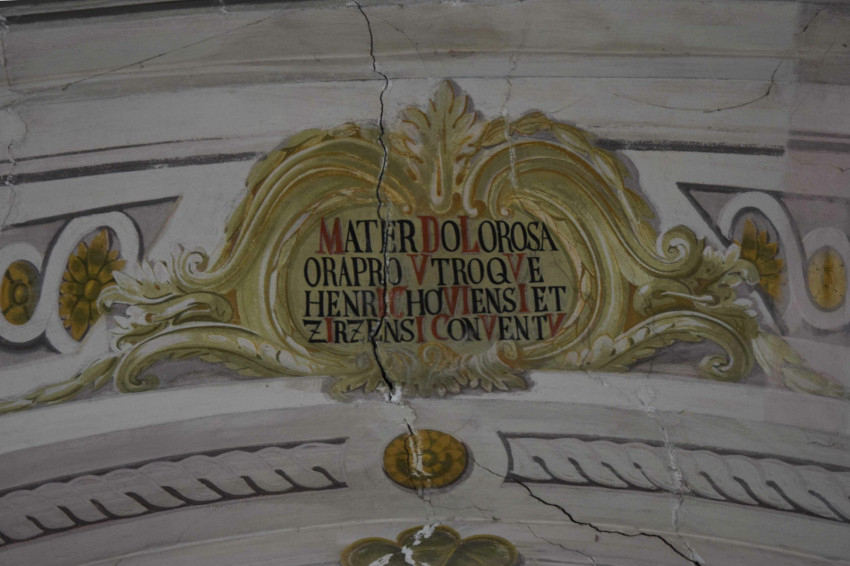 A templom falpillérekre támaszkodó csehsüvegboltozatos hajója háromszakaszos, a diadalív mögötti, egyetlen törtívű lépcsőfokkal emelt szentélye lapos kupola fedésű. A teljes templombelső festett. A hajóban a falpillérek és falsíkok márványt, illetve márványbetétes díszítést imitálnak, a boltozatokon Szűz Mária hét fájdalmát ábrázoló jelenetek láthatók Jézus gyermekségének idejéből a diadalív felől: Jézus körülmetélése; menekülés Egyiptomba; a karzat felett pedig a tizenkét éves Jézus a templomban. A felnőtt Krisztus életének eseményei láthatók a szentélyben: a boltozaton Krisztus keresztútja, illetve az oldalfalakon délre a megfeszítés Szűz Mária, Szent János és Mária Magdolnával; északra pedig a sírbatétel. A barokk kifestés keletkezését a diadalív kronosztikonjának felirata adja meg: „Fájdalmas Szűz Anya imádkozz a heinrichaui és a zirci konventért.”