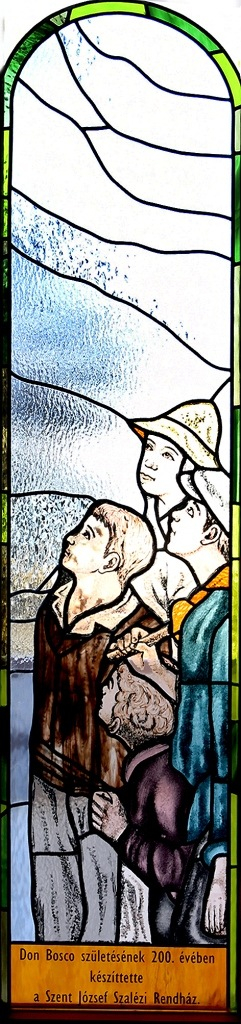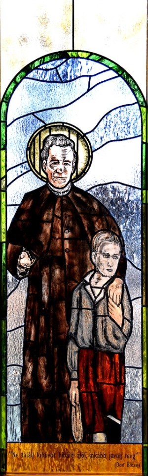 Az üvegablakokat Soós Csilla felvidéki művész készítette, aki a több száz éves hagyományokat töltötte meg modern tartalommal. Alkotása két ólomüveg ablak, melyek témájukat tekintve kapcsolódnak egymáshoz. Az egyik képen Don Bosco látható, amint egyik kezét egy ifjú vállára helyezi, s a másik kezével a magasba mutat. A felfelé mutató kéznek szimbolikus jelentése van; egyrészt utat mutat az ifjúnak az ég felé, másrészt a híveket is hívja. Minket is útba igazít Don Bosco, mint ahogy azokat a gyermekeket, akik a másik képen láthatók. Így köti össze a két képet a valósággal a képek készítője, és így válik Don Bosco üzenete – „Ne keress kibúvót hibáid alól, inkább javulj meg!” – egyszerre történetté és üzenetté a mai ember számára. Az alkotó Don Bosco egyik fontos feladatát kívánta hangsúlyozni: a gyóntatóét, aki segít megtisztulni a bűneinktől, s ezzel a megtisztulással Isten előtt megnyitni az utat. Az ő személyes odafigyelése és lelkivezetése Isten irgalmasságát tükrözi.