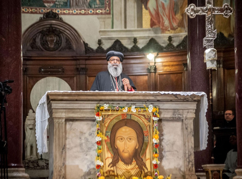 Az evangélium (Márk 6,30–44) olvasása után Abuna Matthias ezekkel a szavakkal fordult a közösség tagjaihoz: „Szívből üdvözöllek mindnyájatokat: Isten áldjon meg benneteket! Sokat hallunk a munkátokról, mindarról, amit tesztek, és Istennek hála, ma itt lehetünk köztetek, mert Rómában meglátogatjuk alapító atyáink egyházát.