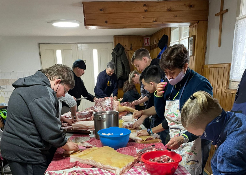 Ám a disznótoron jelenlevők nem önmagukért, hanem egy nemes ügy érdekében dolgoztak: a finomságokkal időseket, nehéz körülmények között élő rászorulókat ajándékoztak meg az egyháztanácsosok. Közel ötven csomagot kézbesítettek.