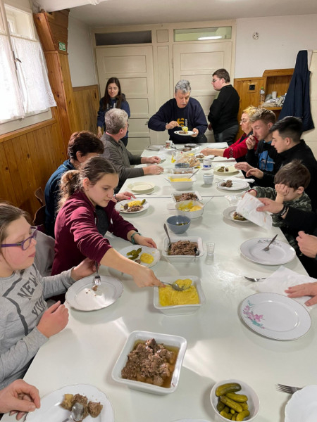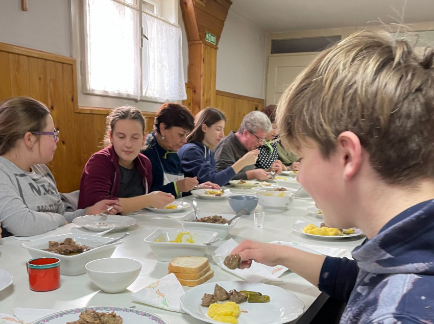 Az asszonyok finom pörköltet főztek ebédre. Tizennyolcan ültek le a terített asztalhoz.