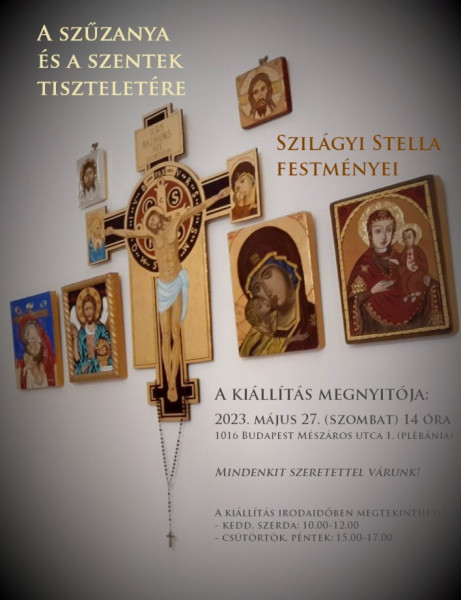 A plébánia (Budapest I., Mészáros u. 1.) nagytermének falai nem sokáig maradnak üresek: pünkösd előtti szombaton, május 27-én 14 órakor nyílik meg Szilágyi Stella, a helyi Havas Boldogasszony-templom sekrestyésének ikonfestmény-kiállítása A Szűzanya és a szentek tisztelete címmel. A tárlat a következő időszakban irodaidőben megtekinthető: kedden és szerdán 10–12-ig, valamint csütörtökön és pénteken 15–17 óráig.