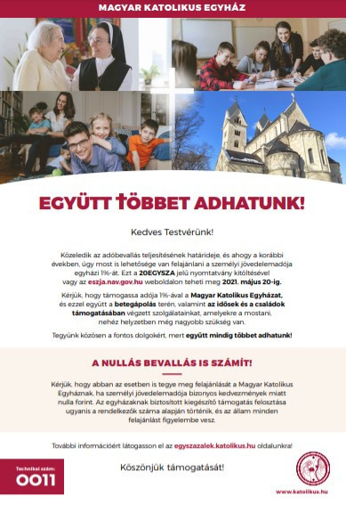 Kérjük, hogy abban az esetben is tegyék meg a felajánlást a Magyar Katolikus Egyháznak, amennyiben adóbevallást kell készíteniük, de a befizetendő személyi jövedelemadó bizonyos kedvezmények miatt nulla forint.