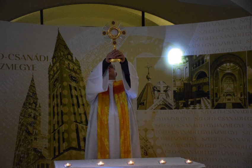 Az imaalkalom során Nagy Róbert szőregi plébános tartott elmélkedést, aki arra biztatta a jelenlévőket, hogy merjenek Istenre nézni, mert Ő az, aki a legmélyebben ismeri az embert. „Ő kimondja a nevem, és így a szentségimádásban párbeszéd jön létre közöttünk. Csendes, személyes és a legmélyebb bizalomban megélt imádság” – tanított a plébános.