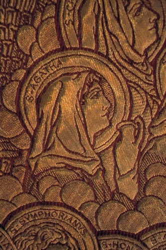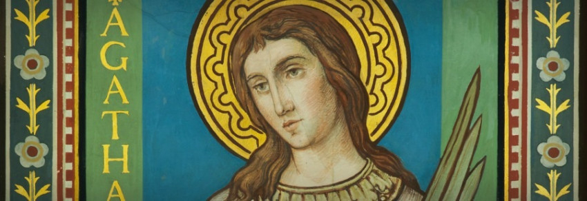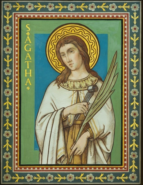 A pécsi székesegyház szentélyében, a mennyezeten megjelenő szentek északi sorában Ágotát félalakban láthatjuk. Baljában a vértanúság diadalát hirdető palmettát, jobbjában kínzásának egyik eszközét, a harapófogót láthatjuk. Más ábrázolásokon írótáblával, tálon elhelyezett levágott keblekkel, fáklyával vagy gyertyával, kenyérrel, égő házzal és egyszarvúval is ábrázolják. Szent Ágota tisztelete gyorsan elterjedt a keresztény világban. A középkori hagyományban a tűz ellen kérték segítségét. Ünnepnapján a sírfeliratát elvitték a templomba, hogy a pap megszentelje azt, majd a papirost a ház kapujára tűzték, hogy távol tartsa a tüzet. A 12. század óta szokás volt nevét a tűzvészt jelző harangra írni. Az újkorban Magyarország több vidékén kenyeret szenteltek ünnepén, amelyről úgy tartotta a néphagyomány, hogy védelmet nyújt a tűz ellen. A hiedelem Ágota napját tartotta alkalmasnak a házi férgek eltávolítására. Jászladányban és a délvidéki magyarok körében szokás volt e napon a ház és az ólak alapos körülsöprése. Az időjóslás szerint „ha Ágota még szorítja, de Dorottya majd tágítja”, vagyis ha Ágota napján fagy, akkor másnaptól enyhülni kezd az idő.
