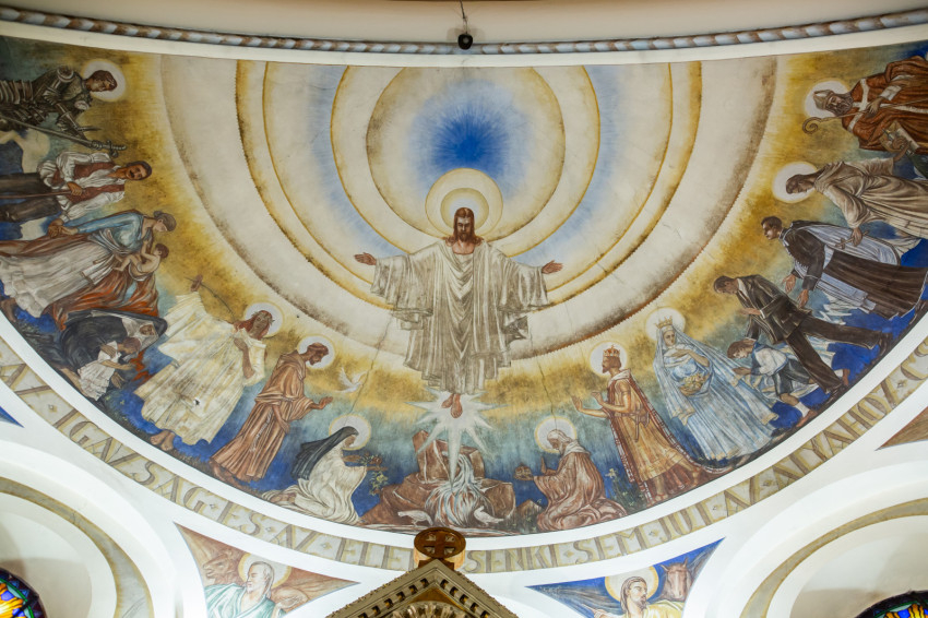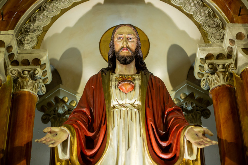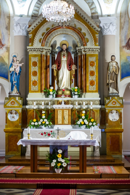 Belépve azonnal feltűnik a főoltár Jézus Szíve-szobra, mely különleges: