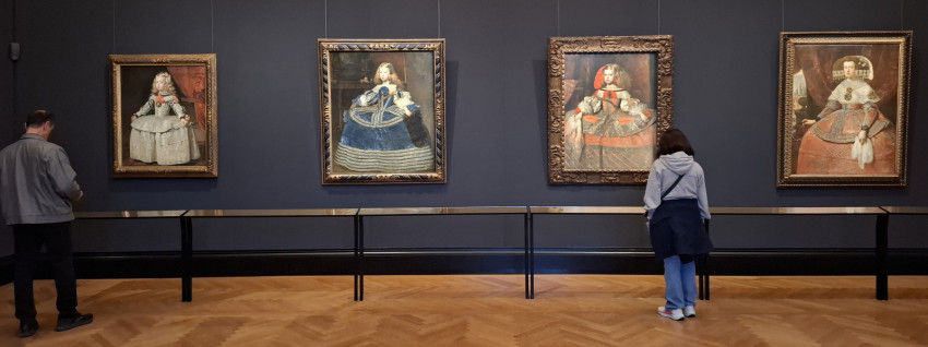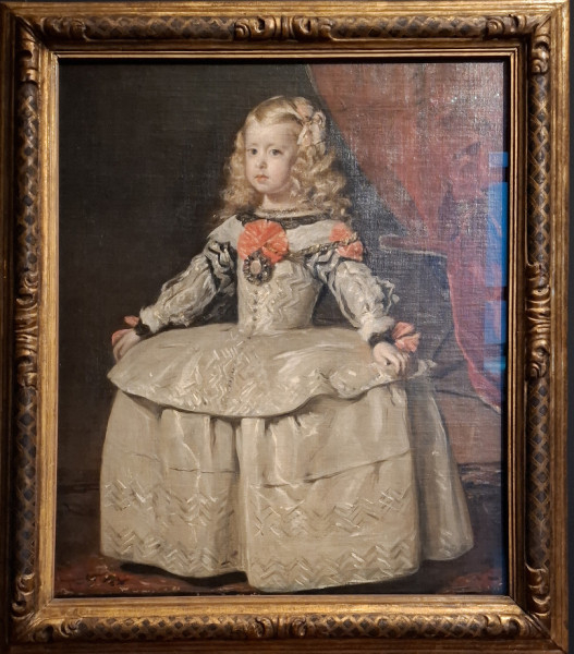 A termeken továbbhaladva lassan elérkezünk a korszak egyik legkiválóbb festőjéhez, Diego Velázquezhez (1599–1660). A Margarita Teresa infánsnő fehér ruhában című festményen egy ötéves gyermeket látunk, de mintha csak felnőtt volna, olyan a testtartása. Amint a kiállításon megtudhattuk, a Habsburg infánsnő képét a birodalmi követ küldte Bécsbe, és levelében méltatta a kislány határozott viselkedését. Ezzel egy időben készítette Velázquez a madridi Pradóban őrzött, talán leghíresebb alkotását, a Las Meninast (Az udvarhölgyek). Ennek a képnek a közepén szintén ott áll a kis Margarita infánsnő.