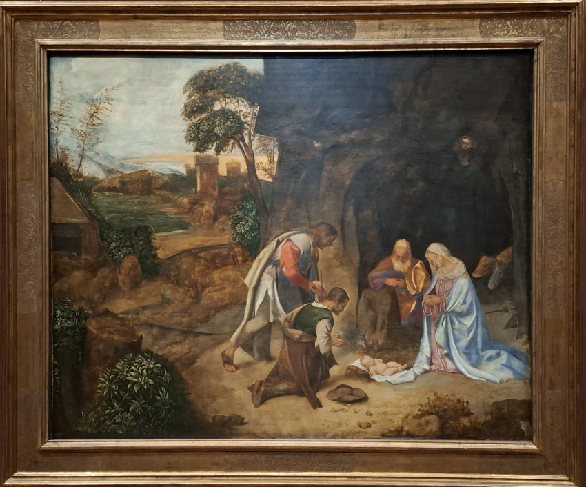 Meg kell emlékeznünk még Tiziano mesteréről, Giorgionéról is. Sajnos nem volt hosszú életű, a harmincas éveiben meghalt, de csodálatosan finoman megfestett képeket hagyott hátra. A pásztorok imádása című alkotásán a már-már alkonyi tájban pihen a Szent Család, amikor a pásztorok meglátogatják a Kisdedet. Tisztelettel és alázattal veszik körül a földön, takarón fekvő, kiszolgáltatott kisgyermeket, aki, mint minden gyermek, ruhátlanul kezdi meg földi életét.