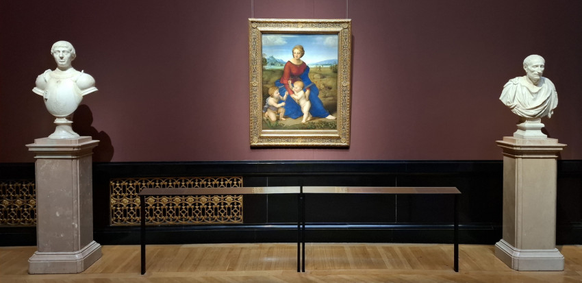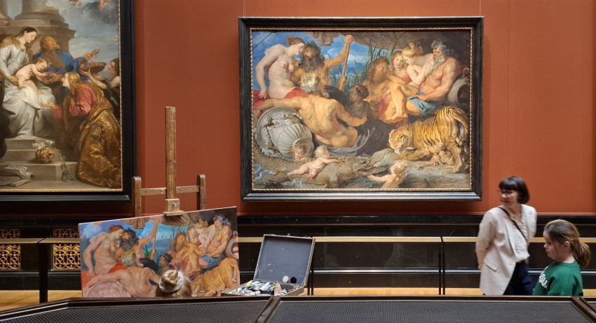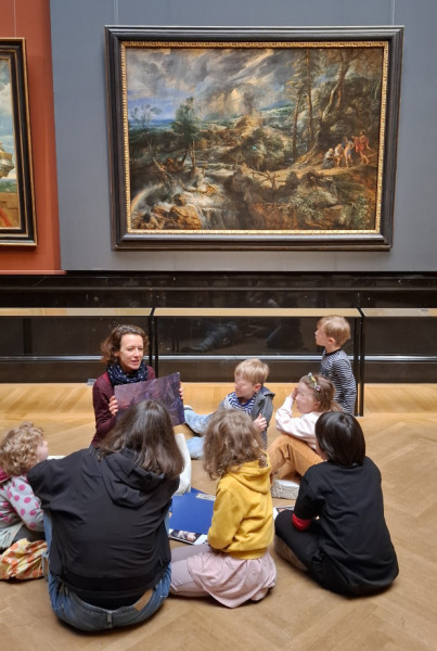 Ahogy teremről teremre haladunk a múzeumban, egyszer csak gyerekzsivajra leszünk figyelmesek: négy-öt éves kicsik vesznek körül a parketten ülve egy fiatal hölgyet, aki lelkesen, játékosan magyarázza, hogy mi látható a falakon. Kisebb méretű reprókat is mutat nekik, mesél róluk. Remekül működik itt a múzeumpedagógia; a vizuális nevelést nem lehet elég korán kezdeni.
