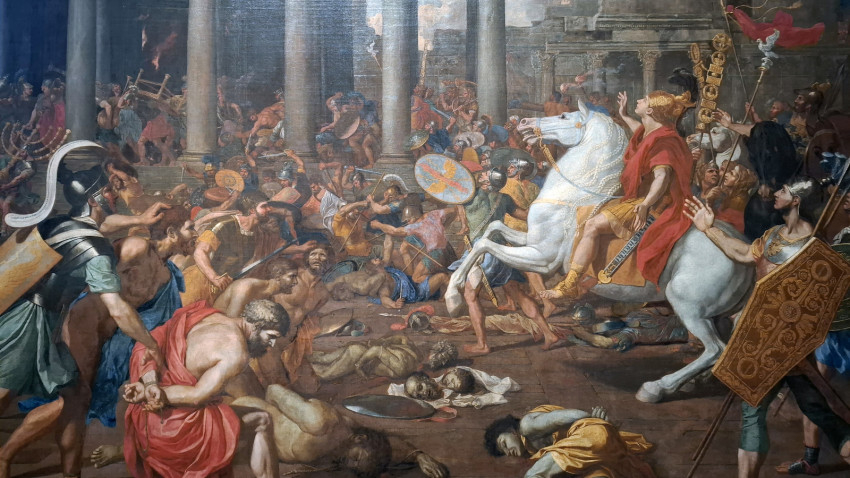 Most nézzünk meg egy kevésbé ismert művet, Nicolas Poussin A jeruzsálemi templom lerombolása című alkotását! A kegyetlen, harcos jelenet Josephus Flavius A zsidók története című könyve alapján készült, amelyben a szerző leírja azt a csatát, amelyet Titus császár és katonái vívtak, hogy megakadályozzák a templom földig rombolását. Poussin, ahogyan a műtörténészek írják, „az antik világban érezte otthon magát”. A kép központi alakja, a császár, kétségbeesetten tekint az ostromlott jeruzsálemi templomra, amely körül öldöklés folyik. Nicolas Poussin az 1600-as évek antikizáló hatású művésze volt. Egyik legismertebb képe a Louvre-ban található, Árkádiai pásztorok címmel.