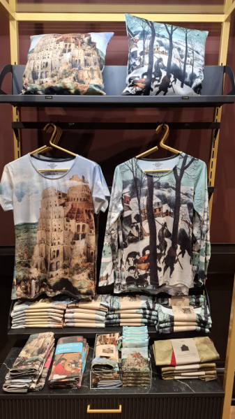 A hatalmas képtár termeit elhagyva végül eljutunk a múzeum shopjába, ahol sokféle emléktárgy között válogathatunk. Kétféle póló is kapható itt, mindegyiken Brueghel egy-egy képének részlete látható.