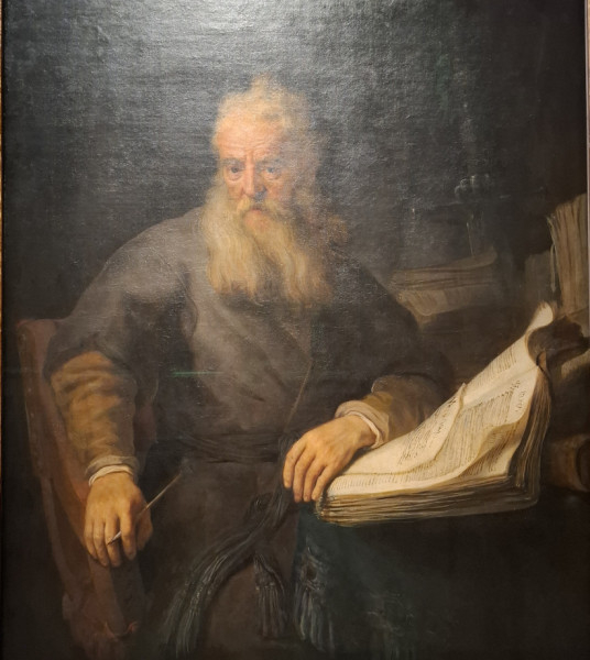 Egy másik festményen Titus, a festő korán meghalt fia könyvet olvas, arcán vidámság tükröződik. Egy további képen nagy szakállú, idős férfit láthatunk egy hatalmas könyvvel. Jobb kezében tollat tart, az a benyomásunk, mintha csak egy pillanatra hagyta volna abba az írást. A tekintélyt sugárzó, hullámos, nagy, fehér szakáll és a vastag, méretes könyv a tapasztalt, bölcs ember kifejezési formái a képzőművészetben. Ha közel hajolunk Rembrandt képeihez, láthatjuk rendkívül puha ecsetvonásait, finom realizmusát. Vásznain nem érződik semmi erőlködés vagy fáradtság. Édesanyja portréja is egyszerűen briliáns; csodálatos, ahogyan az idős asszony arcát és ruháját megfestette. Rembrandttal egyszerűen nem lehet betelni!