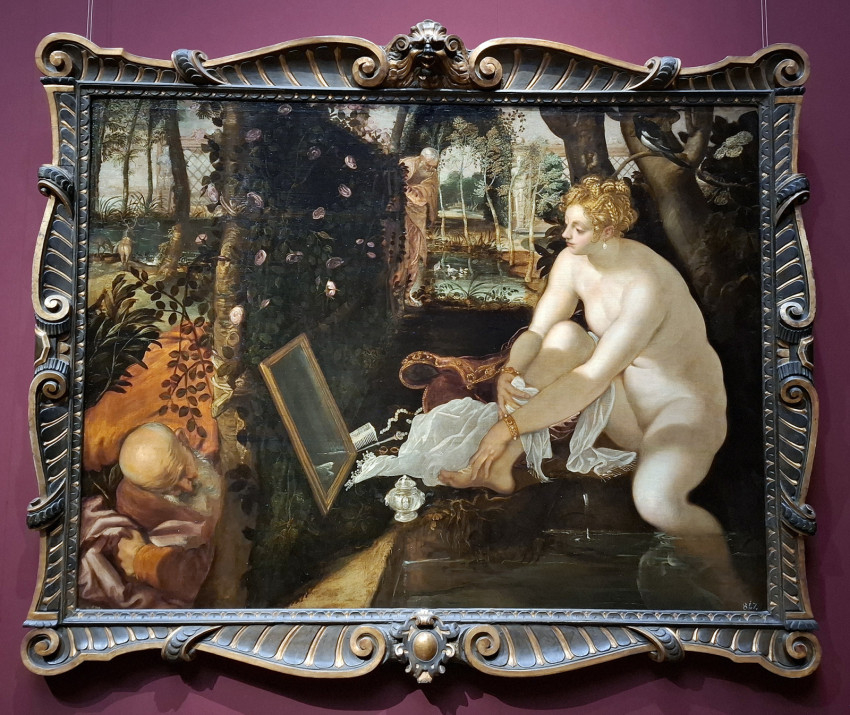 De menjünk tovább, és nézzük most Tintoretto remekműveit, aki Tiziano és Veronese mellett a legnagyobb velencei festő volt. Zsuzsanna a fürdőben című, 1555-ből származó képére már alig emlékeztem, olyan régen láttam utoljára eredetiben. Az ószövetségi történet szerint Zsuzsanna illetlen ajánlatot kapott két titokban betolakodó férfitól, amikor a saját kertjében fürdőzött. Mivel elutasította őket, azok házasságtöréssel vádolták meg, s csak az akkor még fiatal Dániel próféta közbelépésének köszönhetően derült ki a bírák előtt az igazság, és menekült meg Zsuzsanna a halálbüntetéstől. Gazdag növény- és állatvilágával meghatározza a festményt a mesés kert. Éles ellentét feszül Zsuzsanna szépsége és fiatalsága, illetve a bűnös vágyaktól fűtött két öreg férfi rosszindulata között. A világos és a sötét tónusok uralják a képet, afféle „vihar előtti csend” van, egyelőre még nyugalom árad a néző felé a vászonról.
