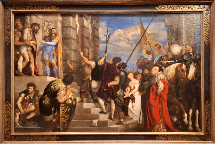 Azután megérkezünk minden idők egyik legnagyobb mesteréhez, Tizianóhoz. Hosszú élete során elképesztően dekoratív, mégis mély érzésekről tanúskodó, drámai képeket festett. Itt a Kunsthistorisches Museumban látható Ecce Homo (1543) című alkotása, amely mindenképpen szokatlan ábrázolás. A nagy méretű vásznon Krisztus nem a kép közepén áll, hanem balra fenn, a sarokban, egy lépcsősor tetején lép a gesztikuláló, háborgó tömeg elé. Szenvedő, ruhátlan alakja éles ellentétben áll a mellette lévő kék ruhás, arany köpenyes Pilátussal. Krisztus alatt, a lépcső tövében egy fiatalember jól láthatóan felkiált az izgatottságtól, miközben kutyáját magához öleli.