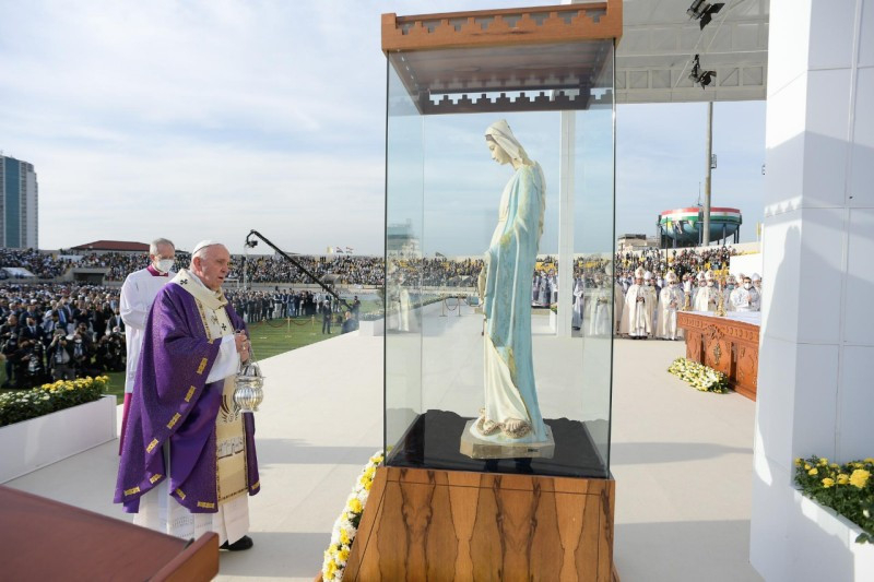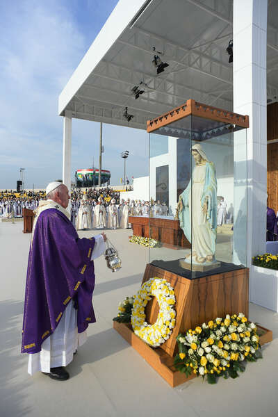 A pápa mellett állt a Mária-szobor, amely szintén sebeket hordoz: az úgynevezett Iszlám Állam vandalizmusának nyomait. A Moszulhoz közel, a Ninivei-fennsíkon fekvő, keresztény többségű Karemles Szent Adday-templomához tartozik a szobor, amelyet részlegesen állítottak helyre: a fejet visszahelyezték, a kezeket azonban szándékosan nem: hogy mindig emlékeztessen a csonkításra, a szobor kézfejét lazán rögzítették csak a karra.