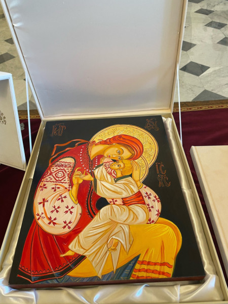 Novák Katalin köztársasági elnök a Szentatyának egy Szűz Mária a kis Jézussal-ikont nyújtott át, amelyet a kárpátaljai magyar hívek szántak ajándékul a pápának.