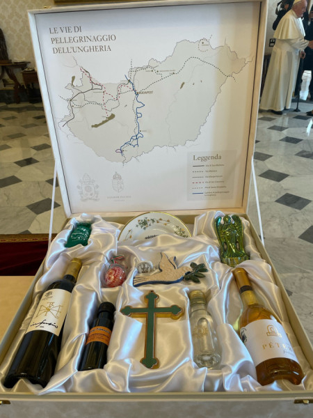 A köztársasági elnök emellett egy pannonhalmi Infusio bort vitt ajándékba, István király monogramjával, valamint édesnemes őrölt paprikát, házi áldást egy hollóházi porcelántányéron, tökmagolajat az Őrségből, tokaji misebort, egy zöld feszületet és egy kerámiából készült galambot, olajággal a csőrében.
