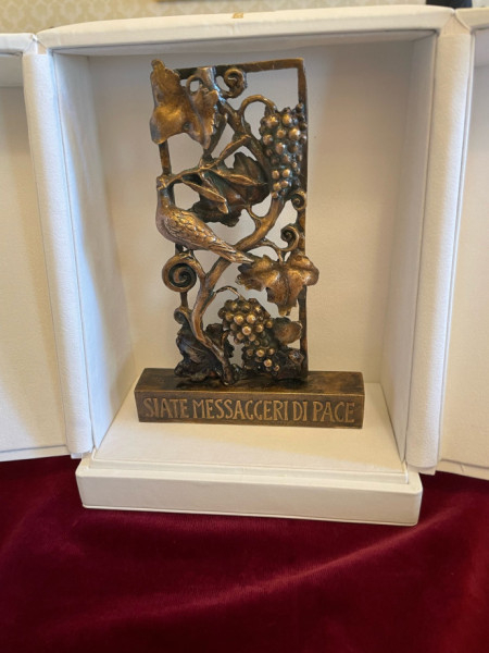 Ez utóbbi „rímel” arra az ajándékra, amit a Szentatya adott az elnök asszonynak: a pápa ez évi béke világnapi üzenetét, amelyet 2022. december 8-án írt, s egy bronzszobrot (madár szőlőindán, a fürtök között), Legyetek a béke követei felirattal. Tehát mindketten a béke szimbólumait nyújtották át egymásnak.