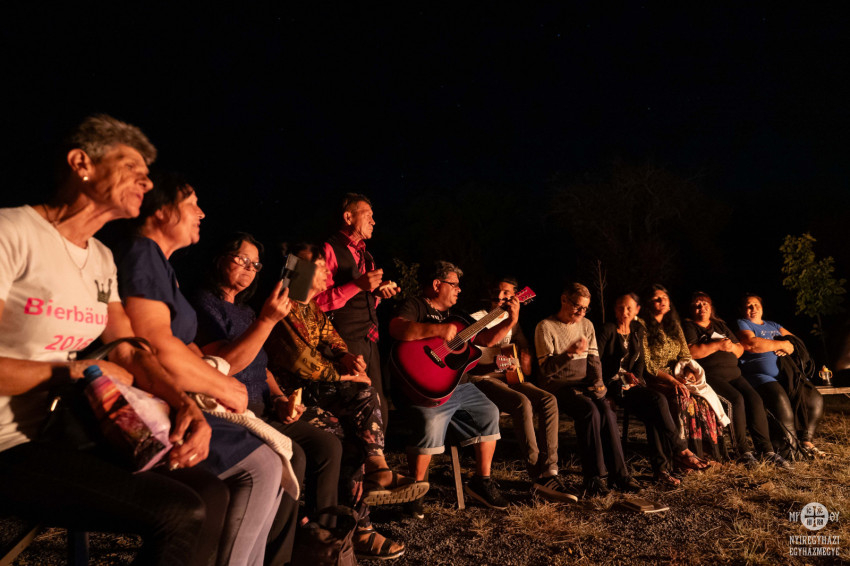 A templomi imák után az udvaron, tábortűz körül szóltak a dicsőítő énekek, gitárkísérettel.