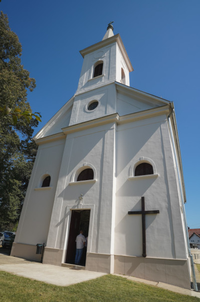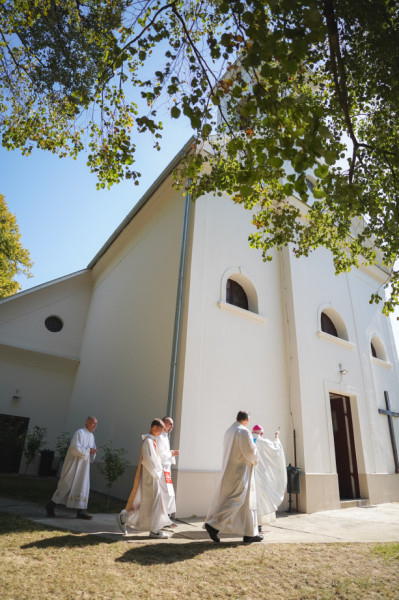 Az áldás szavait követően Varga László kaposvári megyéspüspök meghintette szenteltvízzel a külsőleg felújított templomot.