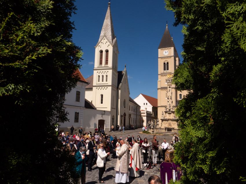A Szentháromság téren, az érseki palota erkélye alatt az Udvardy György veszprémi érsek által vezetett ünnepi szentmisén koncelebráltak a főegyházmegye papságának jelen levő tagjaival, köztük Márfi Gyula nyugalmazott érsek. A szónok Barsi Balázs OFM, a sümegi ferences kegytemplom templomigazgatója volt.