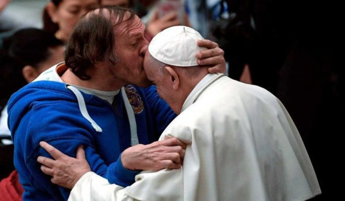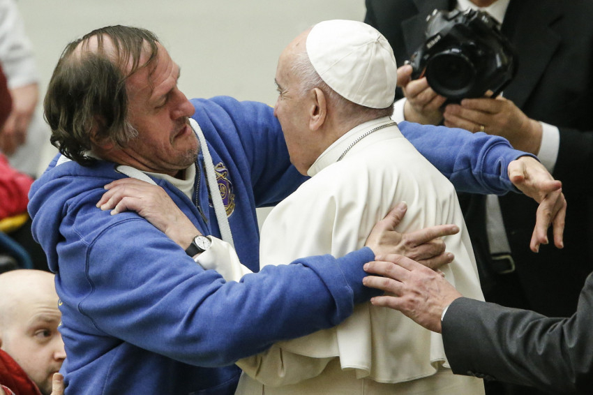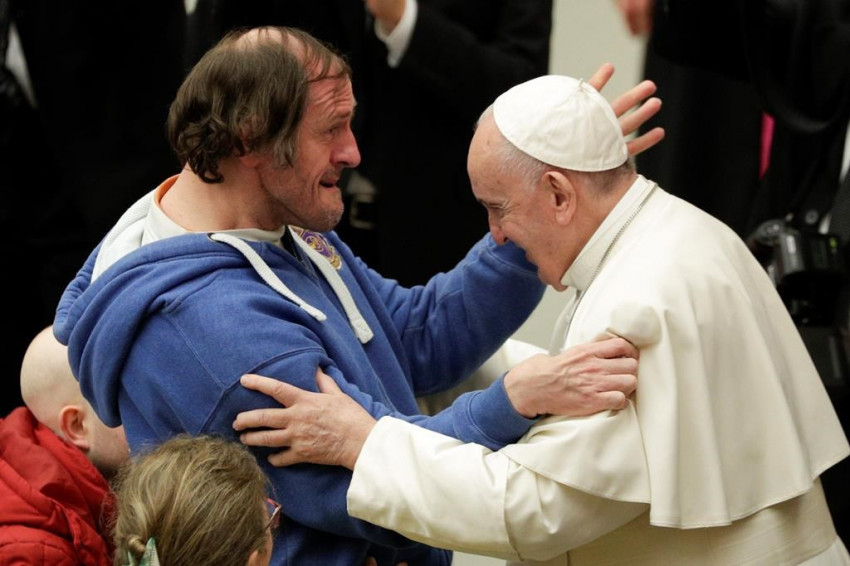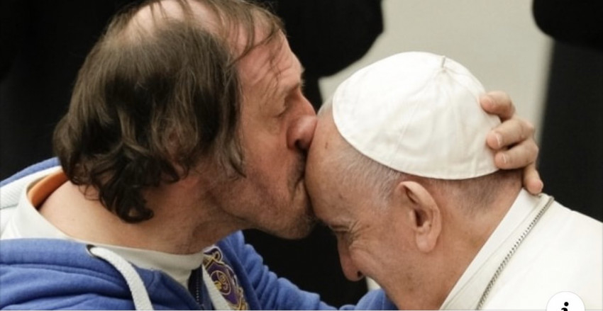 Ki ez az ember? Egy fogyatékkal élő 49 éves férfi, Philippe Naudin, aki a francia karizmatikus mozgalom egyik csoportjával érkezett Rómába, a 89 éves francia színész, Michel Lonsdale kíséretében (aki az Emberek és istenek című filmben Luc testvért játszotta).