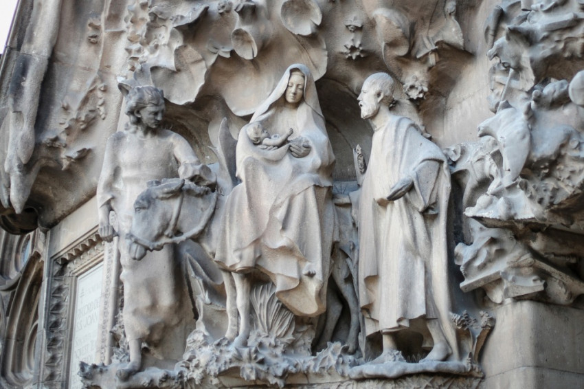 A három templomkapu közül a legnagyobb a középső, a „Szeretet Kapuja.” Krisztus születését látjuk rajta, a szeretet szimbólumával, egy pelikánnal, akiről köztudott, hogy vérével táplálja a fiókáit – ez utalás egyúttal az Oltáriszentségre is. Ettől balra esik a „Remény Kapuja”, amelyen Jézus gyermekkorának két drámai eseménye, a betlehemi gyermekgyilkosság és az Egyiptomba menekülés kapott helyet. Végül a főkaputól jobbra esik a „Hit Kapuja”, a Jelenések Könyvéből vett bibliai jelenetekkel. Szimbolikus magyarázata van annak, hogy a reményt keltő motívumokat miért a keleti homlokzatba faragták. „Ex oriente lux”, azaz Keletről jön a fény, s vele az üdvözülés. Krisztus szenvedései az ellenkező, tehát a nyugati oldalra kerültek, vagyis oda, ahol a Nap lenyugszik. A keleti homlokzat harangtornyainak spirálisan felfelé tartó nyílásai között a „Sanctus, Sanctus, Sanctus” olvasható, amely felfelé vonzza a tekintetet, úgy hat, mint vidám örömujjongás az Ég felé.