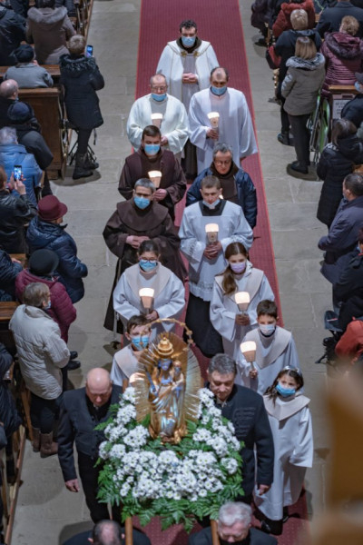 A szentmise után ismét a helyi imacsoport vezetésével imádkozták a hívek az örvendetes rózsafüzért. A kegytemplom előtti téren tartott körmenetben csak az asszisztencia és rózsafüzért imádkozó nők férjei vitték a Szűzanya kegyszobrának másolatát.