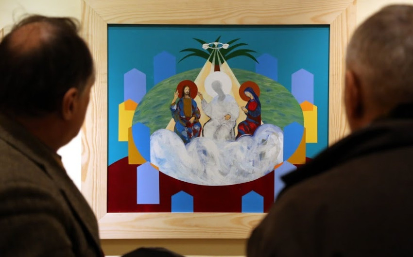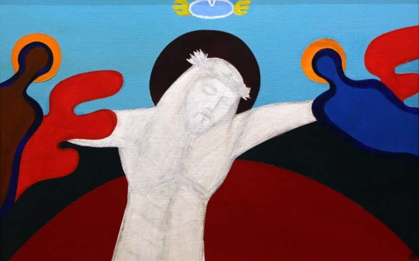 A kiállított arcok azonban, amelyek körbeveszik a látogatót, egyetlen arc felé mutatnak: az apszis félköríves terében látható Krisztus-arcra, amely a festmények konstruktív-geometrikus terében, valamint az ezekben a terekben ábrázolt absztrakt angyalfigurák között egyedül kivehetőként jelenik meg.