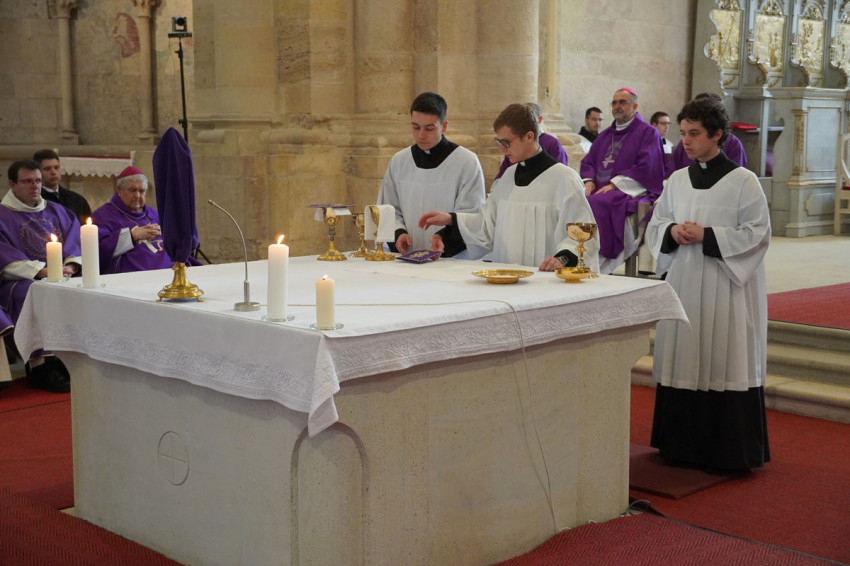 Az akolitusjelöltek is az érsek elé járultak, a főpásztor átadta nekik a szentmise ünneplésére előkészített adományokat, mondván: „Vedd ezt az Eucharisztia ünneplésére előkészített kenyeret, és úgy élj, hogy méltóképpen szolgálhass az Úr és az Egyház asztalánál.”