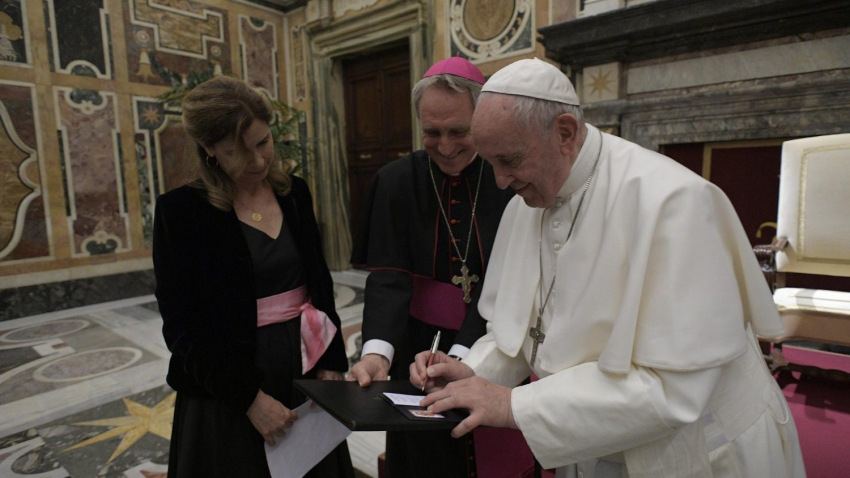 Beszéde végén a Szentatya megajándékozta az újságírókat: átadta nekik a Comunicare il bene (A jót kommunikálni) című kötet egy-egy példányát, amely Ferenc pápa az újságírók különböző csoportjaihoz intézett beszédeit, illetve a tömegtájékoztatás világnapjaira írt üzeneteit tartalmazza.