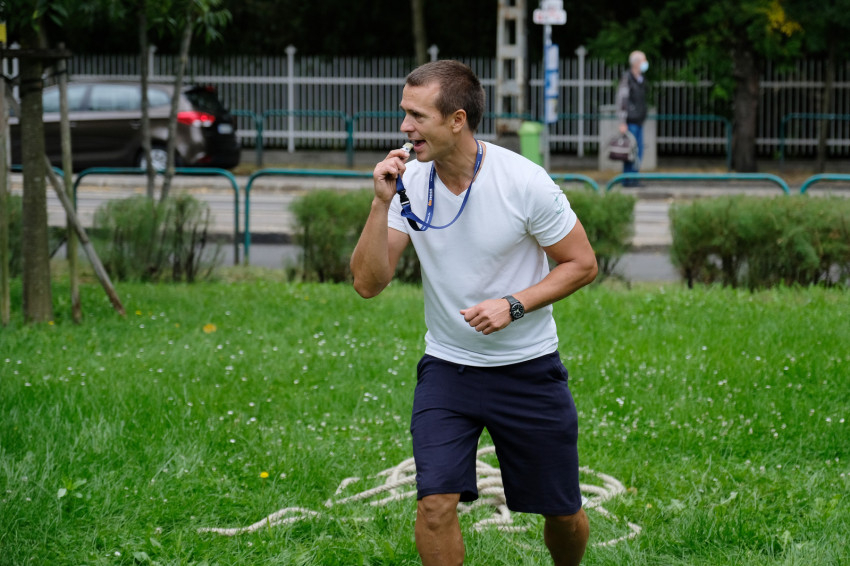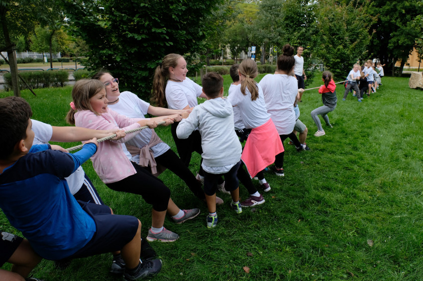 Nem messze tőlünk Kürti Zoltán kötélhúzással várja a gyerekeket, akik nagyon figyelnek, tudják, hogy sípszóra, és nem a becsapós tapsra foghatják meg a kötél két végét. A testnevelő azt is elmondja nekik, hogy