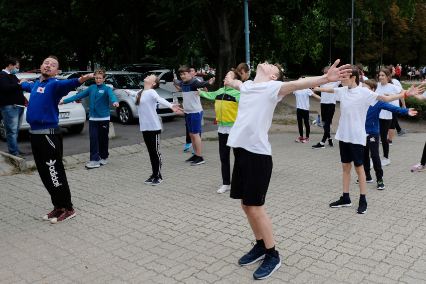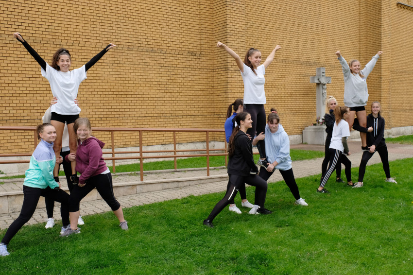 Egy fiúcsapat lelkesen táncol a templom bejárata előtti téren a Billie Jeanre, mások hullahopp karikával vagy pompomokkal lejtenek – meglepetésünkre még a fiúk is élvezik ezt a mozgásformát. A templom egyik oldalán csapatokban ugróköteleznek, másik oldalán pedig labdajátékokat űznek.