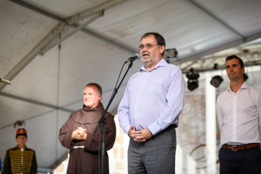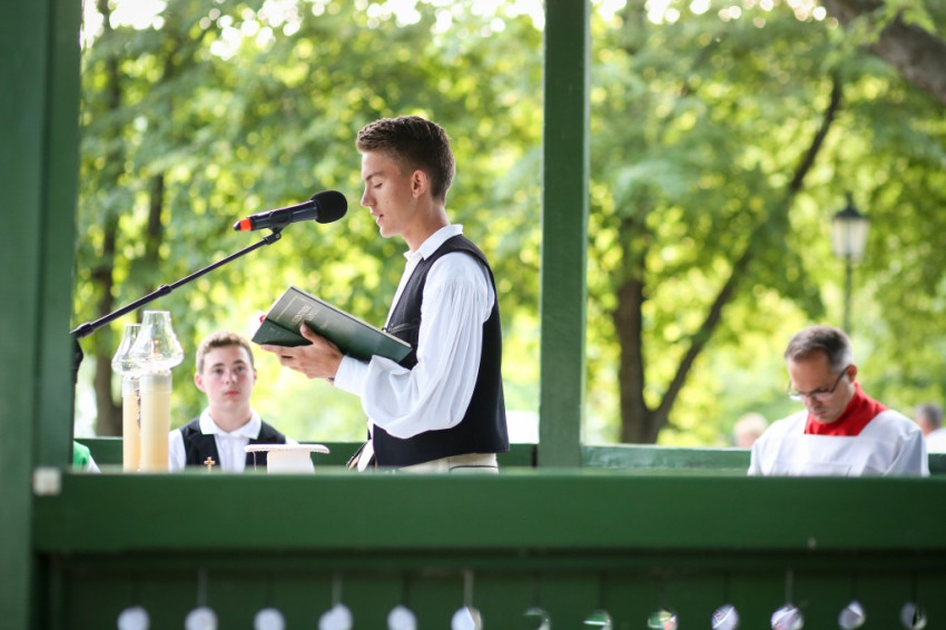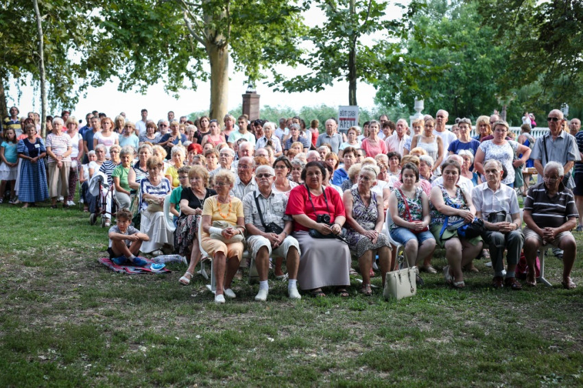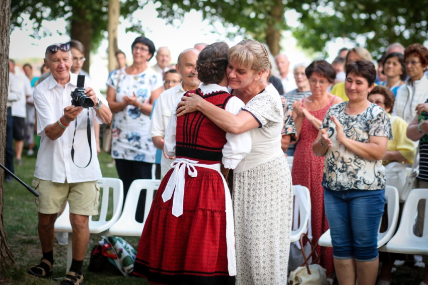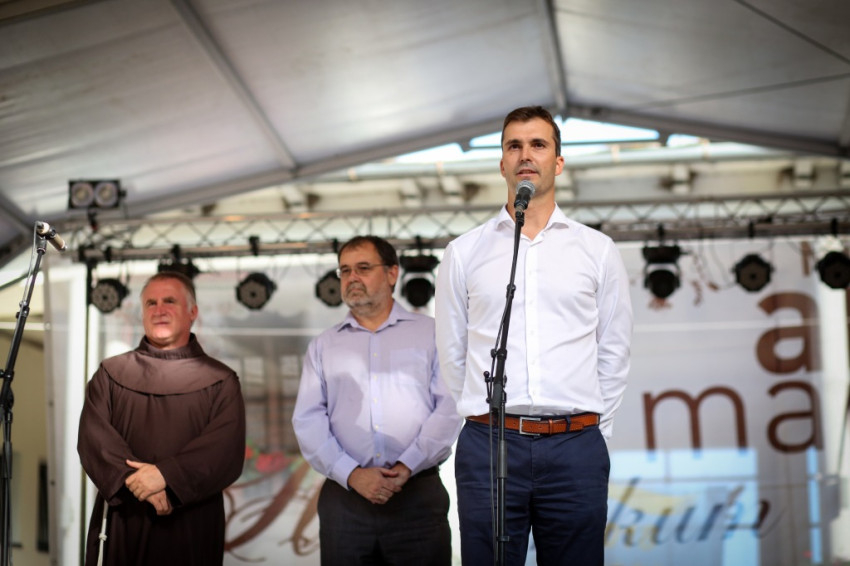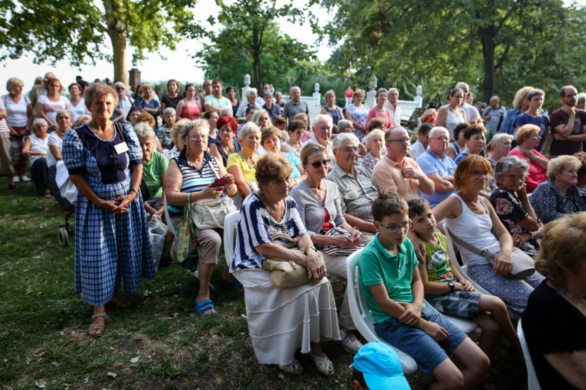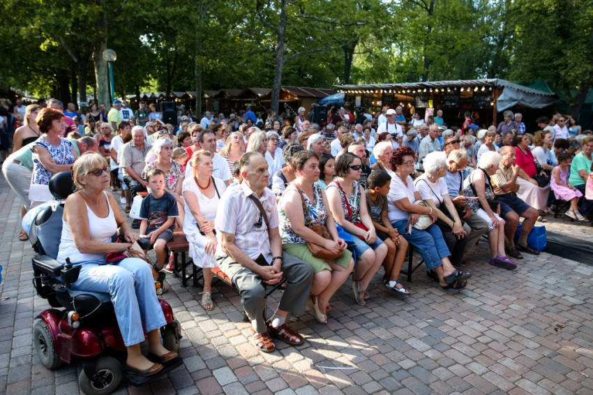 Aztán Csaba testvér, Keszey János, Balatonalmádi polgármestere és Gyenes Ákos, a Balatonalmádi Turisztikai Egyesület elnökhelyettese lép a színpadra. Megtudjuk, hogy ez már a tizedik hungarikumfesztivál, és hogy évről évre nő a törvényi védelmet élvező hungarikumok száma. Most hetvennél tartanak, a fesztiválon huszonhéttel lehet ezek közül találkozni. Új elem, hogy idén magyar vadászkutyafajtákat és a solymászatot is bemutatják itt. De – mondja Gyenes úr – a magyar nóta, a táncház és a cigányzene is a hungarikumok közé tartozik, sőt az operettet és a retródiszkót is megemlíti, ezekkel is meg fogják örvendeztetni a fesztivál látogatóit a következő tizenkét napon. Hogy ezek is hungarikumok-e, azt nem tudom, de bizonyára sokak örömére szállnak majd a dallamaik az almádi éjszakában. A polgármester megnyitja a fesztivált, majd szerényen átadja a szót Csaba testvérnek, aki azzal kezdi: örülne, ha a nagy család is hungarikummá válhatna, ha az iskoláink-templomaink megtelnének. Köszöni, hogy minden évben akkora vendégszeretettel fogadják a vele érkező, 2005-ben alapított, azóta nemzetközi sikereket arató, Magyar Örökség díjas Marosszéki Kodály Zoltán Gyermekkart, amely utána fog énekelni. Aki hosszabb elmélkedésre is kíváncsi, és a gyerekeket is szívesen hallgatná még, jöjjön át a zenepavilonhoz hétre, ott ugyanis misézni fog, teszi hozzá.