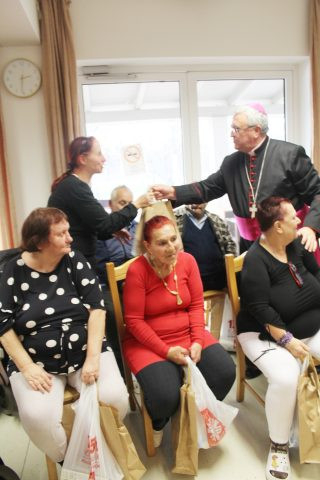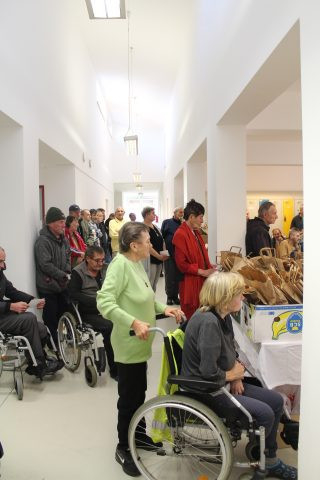 A műsor végeztével Veres András püspök a karitász és a szálló munkatársaival együtt osztotta ki a tartós élelmiszert, édességet és higiénés termékeket tartalmazó kétszáz csomagot.